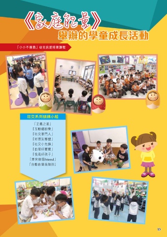 《家庭能量》 舉辦的學童成長活動 ʃʃʔࡀॽ̼ՅҤԃሙ 社交系列訓練小組 「正義之星」 「互動繽紛樂」 「社交掌門人」 「好朋友聯盟」 「社交小先鋒」 「自理好寶寶」 「我是好孩子」 「齊來做個friend」 「自動自覺我做到」 13