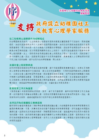 項的困難。現時,政府提供資助讓社會福利機構可以申辦幼稚園社工服務,望將來的日子政