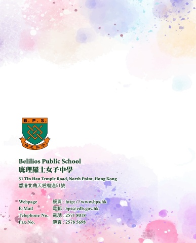Belilios Public School 庇理羅士女子中學 51 Tin Hau Temple Road, North Point, Hong Kong 香港北角天后廟道51號 Webpage 網頁 : http://www.bps.hk E-Mail 電郵 : bps@edb.gov.hk Telephone No. 電話 : 2571 8018 Fax No. 傳真 : 2578 5698