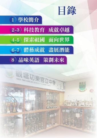 目錄 1 學校簡介 2-3 科技教育 成就卓越 4-5 探索祖國 面向世界 6-7 體藝成就 盡展潛能 8 品味英語 策劃未來