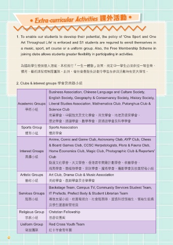 為協助學生發展個人潛能,本校推行「一生一體藝」政策,規定中一學生必須參加一項音樂、