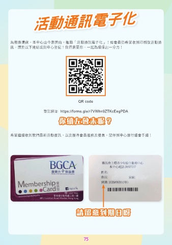 活動通訊電子化 為嚮應環保,本中心由今期開始,推動「活動通訊電子化」!如會員仍希望收到印刷版活動通 訊,請於以下連結或到中心登記!我們需要你,一起為環保出一分力! QR code 登記網址 https://forms.gle/r7VWhn9ZTKcEegPDA 你續左會未呢? 希望繼續收到我們最新活動資訊,以及獲得會員服務及優惠,記得到中心進行續會手續! 請留意到期日呀 75