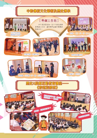 中國傳統文化藝術及歷史傳承 【粵劇工作坊】 本年度訓育組為一至六年級各級舉 辦粵劇工作坊,讓同學們認識中國傳統 戲曲文化。 不但會唱粵曲, 視唱:「工、尺、何、士……」 還會跳水袖舞。 耍槍耍棍,似模似樣。 齊齊學做蘭花手 撐羅傘,展功架 敲敲鑼,打打鈸;手、眼、心靈齊配合。 歷史X戲劇互動教育講座— 《穿越紫禁城》 讓我們帶領大家一同走進 皇帝的家—紫禁城 填填看,紫禁城知多少? 齊來認識紫禁城 13