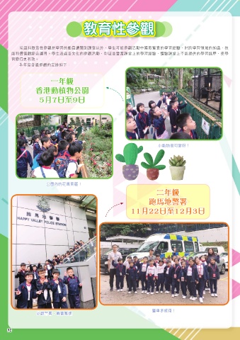 教育性參觀 教育性參觀 常識科教育性參觀把學習的範圍擴闊到課室以外,學生可從參觀活動中獲取寶貴的學習經驗,把跨學習領域的知識、技 能和價值觀綜合運用。學生透過各文化的參觀活動,印証並豐富課堂上的學習經驗,體驗課堂上不能提供的學習經歷,使學 習變得更有效。 本年度各級參觀的安排如下: 一年級 香港動植物公園 5月7日至9日 小動物很可愛呀! 公園內的花真美麗! 二年級 跑馬地警署 11月22日至12月3日 警車多威風! 參觀警署,機會難逢 32