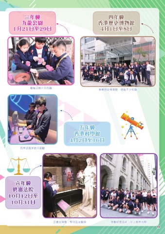三年級 四年級 九龍公園 香港歷史博物館 1月21日至29日 4月1日至8日 種植活動十分有趣 參觀歷史博物館,增進不少知識 五年級 香港科學館 4月2日至16日 同學認真地進行實驗 六年級 終審法院 10月12日至 10月31日 正義女神像,堅守法治精神 參觀終審法院,令人眼界大開 33
