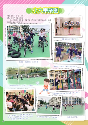 小六畢業營 小六畢業營 日期:2019年5月9 - 10日 地點:鯉魚門公園及度假村 小六的同學快將畢業,畢業營對他們來說有著難忘的回憶,就讓 我們重温當日的温馨片段。 看看我射箭的技術吧! 跟同學一起踏單車,份外高興! 繩網陣的小挑戰,讓我們來試試吧! 男女排球混合賽,比賽第二,友誼第一! 兒童遊樂場也是受歡迎的地點,猜不到吧! 共話六載情誼—同學們真誠對話,感 謝多年來一起成長的小伙伴,不少同學 在戶外場地打羽毛球,感覺真好! 同學們在打籃球 感動落淚,場面溫馨、感人。 40