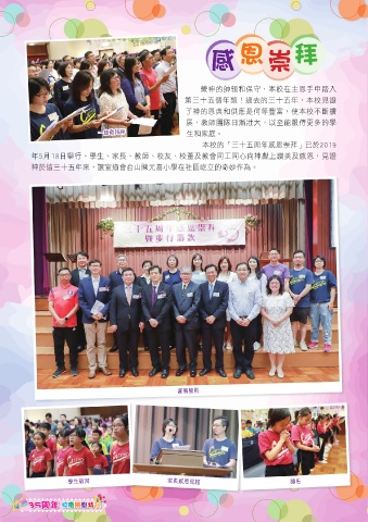恩 拜 感 崇 蒙神的帥領和保守,本校在主恩手中踏入 第三十五個年頭!過去的三十五年,本校見證 了神的恩典和供應是何等豐富,使本校不斷擴 展,教師團隊日漸壯大,以至能服侍更多的學 ɓৎหܰग़ 生和家庭。 本校的「三十五周年感恩崇拜」已於2019 年5月18日舉行。學生、家長、教師、校友、校董及教會同工同心向神獻上讚美及感恩,見證 神於這三十五年來,讓宣道會台山陳元喜小學在社區屹立的奇妙作為。 ྗႷवᅂ ኪ͛หܰ ڗชࢸԈᗇ ᖠѓ 83 35周年 校慶感恩特刊