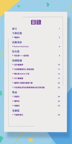 目錄 前言 1 今期焦點 ˙ 電腦科 2 活動剪影 ˙School Activities 4 校友篇 ˙ 校友會—盆菜宴 8 校園點滴 ˙ 弦伴星聲夢 10 ˙ 步操樂團參與上海旅遊節 11 ˙ 學生會 NOVA 介紹 14 ˙ 中六畢業營 17 ˙ 體育科 奧翔計劃簡介會 22 ˙ 科技與生活科及家教會愛心派月餅活動 23 獎項 ˙ 視藝科 24 ˙ 體育科 24 ˙ 音樂科 25 老師篇 ˙ 可藝新面孔 26