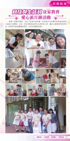 校 園 點 滴 科技與生活科 及家教會 愛心派月餅活動 每年一度製作傳統、冰皮、奶皇月餅活動,科技與生活科聯同家教會成員合 力裹約80盒傳統、冰皮、奶皇月餅送給附近社區的老人院,讓公公婆婆享受佳節食 品,同學也可與長輩傾談交流,非常有意義的活動。 積極向上 友愛朋輩 感恩師長 回饋社會 23