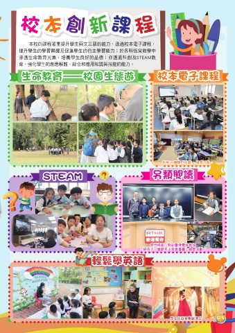 校 本創 新課 程 本校的課程著重提升學生兩文三語的能力,透過校本電子課程, 提升學生的學習興趣及促進學生的自主學習能力;於各科恆常教學中 滲透生命教育元素,培養學生良好的品德;亦透過科創及STEAM教 育,強化學生的創意解難、綜合和應用知識與技能的能力。 生命教育—校園生態遊 校本電子課程 利用VR體驗「地震 」場景活動。 STEAM 另類閱讀 走出校園,到訪香港電台參加 「好孩子•星期天之我愛書叢」錄音活動。 輕鬆學英語 莎士比亞音樂劇演出 03