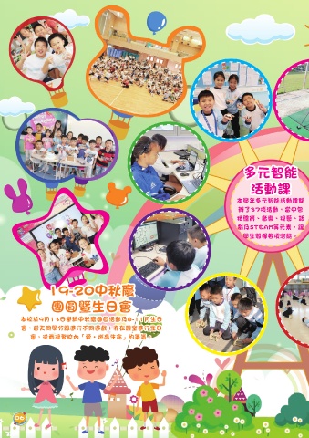多元智能 活動課 本學年多元智能活動課開 辦了37項活動,當中包 括體育、音樂、視藝、話 劇及STEAM等元素,讓 學生發揮各項潛能。 19-20中秋慶 團圓暨生日會 本校於9月13日舉辦中秋慶團圓活動及8-11月生日 會,當天同學分級進行不同遊戲;亦在課室進行生日 會,從而凝聚校內「愛˙燃亮生命」的氣氛。 06
