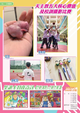 16 文娛版 天主教五大核心價值 及校訓攝影比賽 《生命》 4B 鄉灝然同學作品 《救》 6A 吳肇暉同學作品 《公義》 《家庭》 6A 廖偉業同學作品 2A 羅楠同學作品 聖誕卡封面設計 (2019-2020) 校報編委會 2020年1月號 記 者︰3A 林浩文 3A 葉文昊 3A 林煒凱 3A 陳健豪 4A 謝子俊 4A 葉銘浩 顧問老師:陳婉雯主任 葉菀青老師 5C 梁晉耀同學作品 5C 羅嘉誠同學作品 李珮琦老師