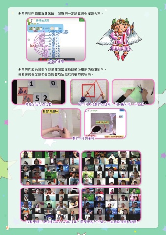老師們利用繪圖詳盡講解,同學們一定能掌握到學習內容。 香港的貨幣 老師們在家也錄製了很多運用數學教具輔助學習的教學影片, 把數學的概念或知識更具體地呈現於同學們的眼前。 依指示組合四位數 用不同方法製作四邊形,例如幾何條、手工紙。 製作1升的量杯 在數學網上導修課Zoom Live的時候,同學們都十分留心,並積極回答和發問。 8