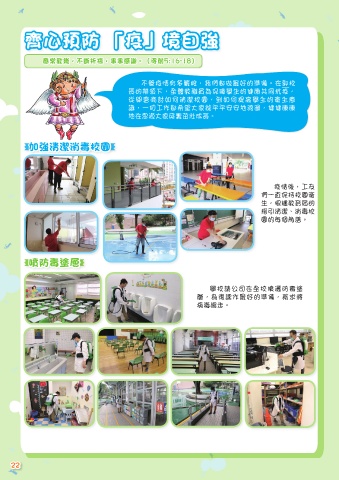 齊心預防 「疫」境自強 應常歡樂,不斷祈禱,事事感謝。(得前5:16-18) 不管疫情有多嚴峻,我們都做最好的準備。在郭校 長的帶領下,全體教職員為保障學生的健康共同抗疫, 從開會商討如何清潔校園,到如何提高學生的衞生意 識,一切工作都希望大家能平平安安地渡過,健健康康 地在思源大家庭裏茁壯成長。 加強清潔消毒校園 疫情後,工友 們一直保持校園衞 生,根據教育局的 指引清潔、消毒校 園的每個角落。 噴防毒塗層 學校請公司在全校噴灑防毒塗 層,為復課作最好的準備,務求將 病毒踢走。 22