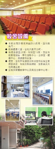 校舍設備 ◆ 本校坐落於環境清幽的小西灣,面向鯉 魚門。 ◆ 校舍樓高七層,佔地六萬平方呎。 ◆ 有標準課室25間,特別室19間,並設有 校園電視台、學生活動中心、自修室、體 藝中心、演講廳等設施。 ◆ 禮堂、全校所有課室及特別室均設有空氣 調節系統、有線及無線網絡、投影器及其 他周邊設備。 ◆ 設有多媒體教學中心及英語自學中心等。