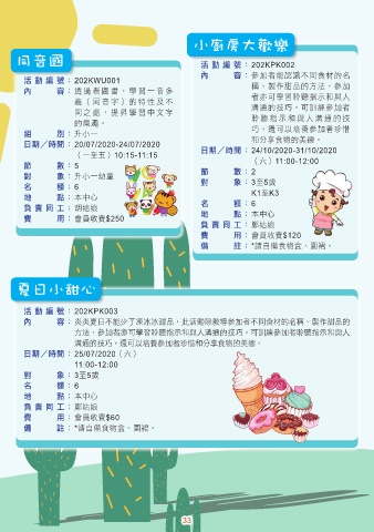 內 容 : 炎炎夏日不能少了凍冰冰甜品,此活動除教導參加者不同食材的名稱、製作甜品的