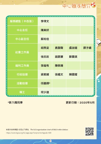 中心職員簡介 中心職員架構圖 服務總監(中西區) 李律文 中心主任 陳美好 中心副主任 蘇裕佳 胡燕姿 袁顯聲 盧淑琨 譚子晴 社會工作員 徐民政 錢嘉慧 鄭寶琪 福利工作員 李福有 陳佩珊 行政助理 梁紫媚 張曦文 陳國耀 活動助理 任鵬暉* 職工 何少連 *新入職同事 更新日期︰2020年5月 4