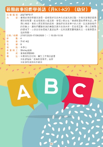內 容 : 暑期故事扮嘢學英語是一個輕鬆好玩的角色扮演英語活動。外籍英語導師運用