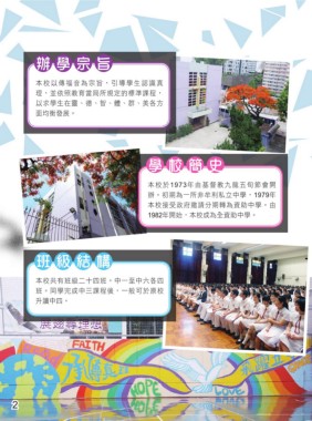 辦 學 宗 旨 本校以傳福音為宗旨,引導學生認識真 理,並依照教育當局所規定的標準課程, 以求學生在靈、德、智、體、群、美各方 面均衡發展。 學 校 簡 史 本校於1973年由基督教九龍五旬節會開 辦。初期為一所非牟利私立中學,1979年 本校接受政府邀請分期轉為資助中學。由 1982年開始,本校成為全資助中學。 班 級 結 構 本校共有班級二十四班。中一至中六各四 班。同學完成中三課程後,一般可於原校 升讀中四。 2