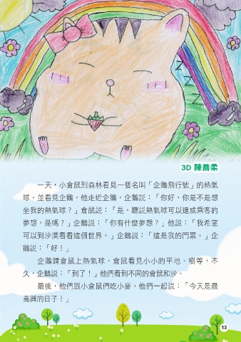 3D 陳善柔 一天,小倉鼠到森林看見一個名叫「企鵝飛行號」的熱氣 球,並看見企鵝,他走近企鵝,企鵝說:「你好,你是不是想 坐我的熱氣球?」倉鼠說:「是,聽說熱氣球可以達成乘客的 夢想,是嗎?」企鵝說:「你有什麼夢想?」他說:「我希望 可以到沙漠看看這個世界。」企鵝說:「這是我的門票。」企 鵝說:「好!」 企鵝請倉鼠上熱氣球,倉鼠看見小小的平地、樹等,不 久,企鵝說:「到了!」他們看到不同的倉鼠和沙。 最後,他們跟小倉鼠們吃小麥,他們一起說:「今天是最 高興的日子!」 13