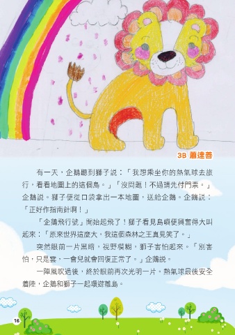 3B 蕭達善 有一天,企鵝聽到獅子說︰「我想乘坐你的熱氣球去旅 行,看看地圖上的這個島。」「沒問題!不過請先付門票。」 企鵝說。獅子便從口袋拿出一本地圖,送給企鵝。企鵝說︰ 「正好作指南針啊!」 「企鵝飛行號」開始起飛了!獅子看見島嶼便興奮得大叫 起來︰「原來世界這麼大,我這個森林之王真見笑了。」 突然眼前一片黑暗,視野模糊,獅子害怕起來。「別害 怕,只是雲,一會兒就會回復正常了。」企鵝說。 一陣風吹過後,終於眼前再次光明一片。熱氣球最後安全 着陸,企鵝和獅子一起環遊離島。 16