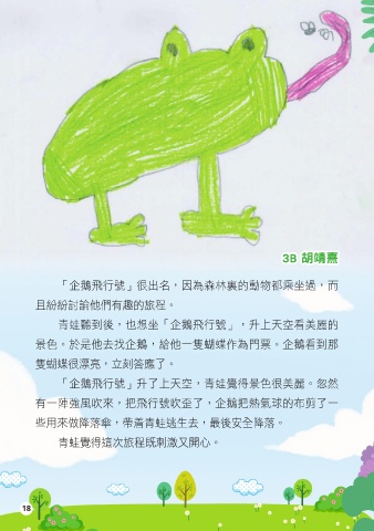 3B 胡靖熹 「企鵝飛行號」很出名,因為森林裏的動物都乘坐過,而 且紛紛討論他們有趣的旅程。 青蛙聽到後,也想坐「企鵝飛行號」,升上天空看美麗的 景色。於是他去找企鵝,給他一隻蝴蝶作為門票。企鵝看到那 隻蝴蝶很漂亮,立刻答應了。 「企鵝飛行號」升了上天空,青蛙覺得景色很美麗。忽然 有一陣強風吹來,把飛行號吹歪了,企鵝把熱氣球的布剪了一 些用來做降落傘,帶着青蛙逃生去,最後安全降落。 青蛙覺得這次旅程既刺激又開心。 18