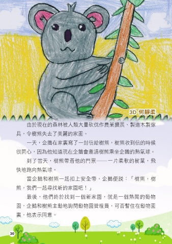 3D 何靜柔 由於現在的森林被人類大量砍伐作農業擴展、製造木製傢 具,令樹熊失去了美麗的家園。 一天,企鵝在家裏寫了一封信給樹熊,樹熊收到信的時候 很開心,因為他知道現在企鵝會邀請樹熊乘坐企鵝的熱氣球。 到了當天,樹熊帶着他的門票─一片柔軟的樹葉,飛 快地跑向熱氣球。 當企鵝和樹熊一起扣上安全帶,企鵝便說:「樹熊,樹 熊,我們一起尋找新的家園吧!」 最後,他們終於找到一個新家園,就是一個熱鬧的動物 園,企鵝和樹熊主動地詢問動物園管理員,可否暫住在動物園 裏,他表示同意。 30