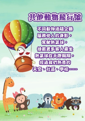 其他動物飛行號 不同動物追隨企鵝 服務他人的身影, 駕駛熱氣球, 接載更多客人乘坐 熱氣球在天際翱翔, 經過我們熟悉的 天空、社區、學校……