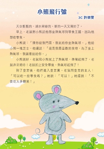 小熊飛行號 3C 許樂雯 天空藍藍的,湖水翠綠的。新的一天又開始了。 早上,老鼠對小熊說他想坐熱氣球到零食王國,因為他 想吃零食。 小熊說:「請你給我門票,我就給你坐熱氣球。」他給 小熊一塊芝士,他還說:「這是我最喜歡的食物,為了坐上 熱氣球,我願意送給你。」 小熊說好,老鼠和小熊就上了熱氣球,準備起飛了,老 鼠非常期待!老鼠扣上安全帶後,熱氣球起飛了! 到了皇宮後,他們進入皇宮裏。老鼠問皇宮的主人: 「可以吃一些零食嗎?」她說:「可以!」她還說:「不 要吃太多糖果!」 61