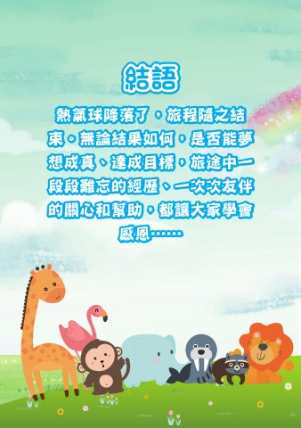 結語 熱氣球降落了,旅程隨之結 束。無論結果如何,是否能夢 想成真、達成目標,旅途中一 段段難忘的經歷、一次次友伴 的關心和幫助,都讓大家學會 感恩……