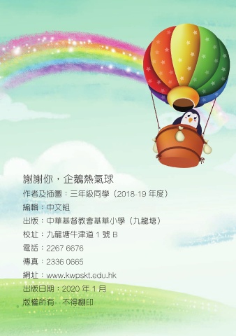 謝謝你,企鵝熱氣球 作者及插圖:三年級同學(2018-19 年度) 編輯:中文組 出版:中華基督教會基華小學(九龍塘) 校址:九龍塘牛津道 1 號 B 電話:2267 6676 傳真:2336 0665 網址:www.kwpskt.edu.hk 出版日期:2020 年 1 月 版權所有 不得翻印
