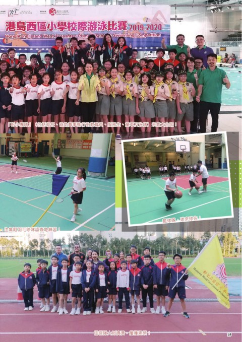 「軒小團隊」(包括校長、協助賽事進行的教職員、服務生、童軍及泳隊)來個大合照! 籃球隊,球來球往! 縱使場地有限制,也無阻羽毛球隊認真地練習! 田徑隊人材濟濟,屢獲殊榮! 15