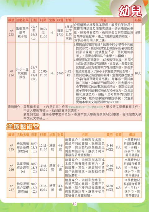 224 試遊戲 29/8 11:00 6 $960 K3 3. 面試故事及演說培訓項目:童書閱讀理解及 10人