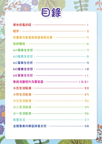 目錄 榮休校長的話 1 程序 2 校董會及家長教師會委員名單 5 教師團隊 6 6A畢業生合照 7 6B畢業生合照 8 6C畢業生合照 9 6D畢業生合照 10 6E畢業生合照 11 各班活動照片及簽名區 12-21 小五生活點滴 22 小四生活點滴 23 小三生活點滴 24 小二生活點滴 25 小一生活點滴 26 教會生活 27 全體畢業同學暨師長合照 28