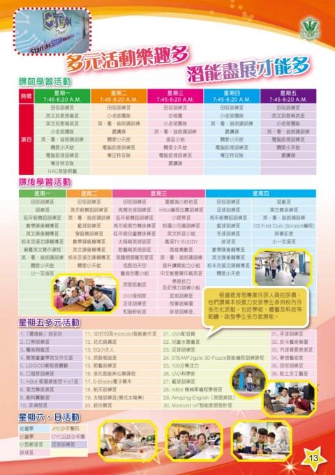1.「體適能」我至叻 11. 3D打印及micro:bit智能創作班 21. 小小配音員 31. 手球訓練班