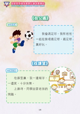 基督教香港信義會紅磡信義學校 2019-2020年度學生文集 ELCHK Hung Hom Lutheran Primary School 《在公園》 1B周煜謙 我會踢足球。我和爸爸 一起在操場踢足球。踢足球 真好玩。 《在課室》 1B陳玥晴 在課室裏,我一邊寫字, 一邊笑,十分快樂。 上課時,同學回答老師的 問題。 16 17