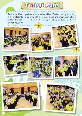 Preparation Po Leung Kuk organized a joint school New Zealand study tour for P.4-P.6 students. In order to let the kids get along and know each other better, the schools held an ice breaking meeting for them on 17th December,2019. 6