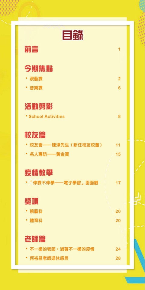 目錄 前言 1 今期焦點 ˙ 視藝課 2 ˙ 音樂課 6 活動剪影 ˙School Activities 8 校友篇 ˙ 校友會—陳津先生(新任校友校董) 11 ˙ 名人專訪—黃金寶 15 疫情教學 ˙「停課不停學—電子學習」面面觀 17 獎項 ˙ 視藝科 20 ˙ 體育科 20 老師篇 ˙ 不一樣的老師,過著不一樣的疫情 24 ˙ 何裕昌老師退休感言 28