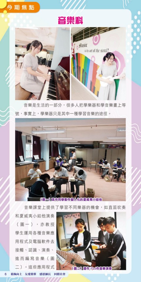 今 期 焦 點 音樂科 音樂是生活的一部分,很多人把學樂器和學音樂畫上等 號,事實上,學樂器只是其中一種學習音樂的途徑。 (圖一)高中同學製作個人化的夏威夷小結他 音樂課堂上提供了學習不同樂器的機會,如直笛吹奏 和夏威夷小結他演奏 ( 圖一 ) ,亦教授 學生運用各種音樂應 用程式及電腦軟件去 接觸、認識、演奏、 進而編寫音樂 ( 圖 二)。這些應用程式 (圖二)運作iPad作音樂演奏 6 積極向上 友愛朋輩 感恩師長 回饋社會