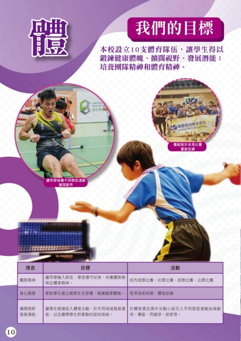 本校設立10支體育隊伍,讓學生得以