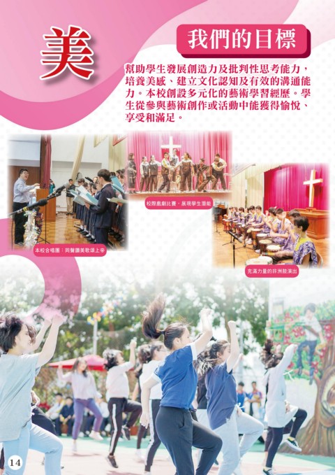 美 我們的目標 幫助學生發展創造力及批判性思考能力, 培養美感、建立文化認知及有效的溝通能 力。本校創設多元化的藝術學習經歷。學 生從參與藝術創作或活動中能獲得愉悅、 享受和滿足。 校際戲劇比賽,展現學生潛能 本校合唱團:同聲讚美歌頌上帝 充滿力量的非洲鼓演出 14