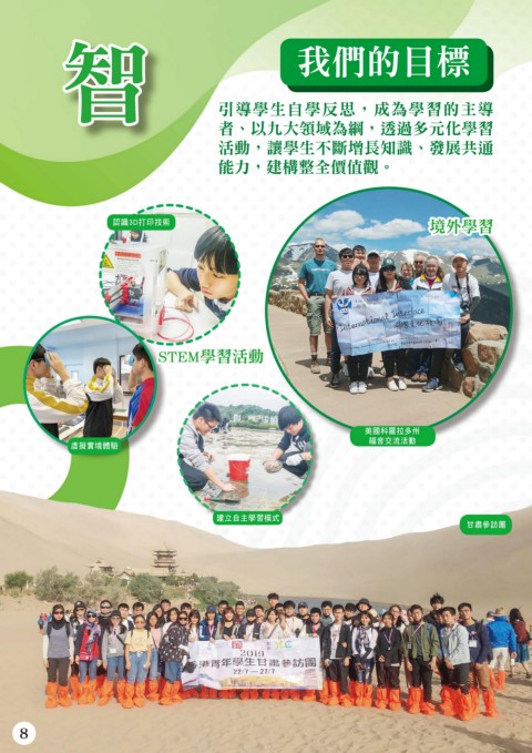 智 我們的目標 引導學生自學反思,成為學習的主導 者、以九大領域為綱,透過多元化學習 活動,讓學生不斷增長知識、發展共通 能力,建構整全價值觀。 認識3D打印技術 境外學習 STEM學習活動 美國科羅拉多州 福音交流活動 虛擬實境體驗 建立自主學習模式 甘肅參訪團 8