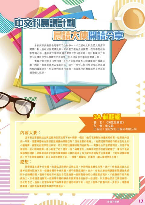 動。因此,負責老師改以電郵形式,給中一及中二級同學發放部分晨讀