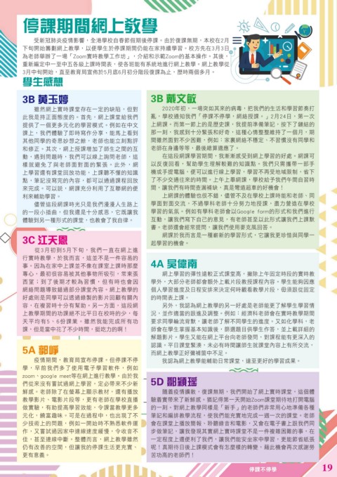 教學影片、電影片段等,更有老師在學校直播 驗着實帶來了新鮮感。猶記得第一天開始Zoom課堂期待地打開電腦