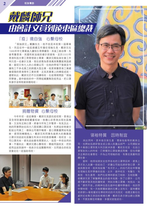 事。不僅如此,戴師兄還心繫母校,聯絡同屆校友,把防 司,也開始迅速研發並成立個人防護品部門,公司還配送