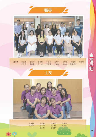 職員 金禧展翅 周漢輝 徐德鳳 梁綺婷 關慧嫻 李御築 潘柳余 吳裕勤 吳詠騫 梁詠柏 江永欣 李倩雯 倪 潔 傅卓君 李嘉敏 彭惠敏 歐陽秀妍 工友 樊志剛 李徐珍 邱群娟 何翠琼 潘炎清 蔡彩嬌 徐紅英 黃健珍 盧活松 鍾麗福 38