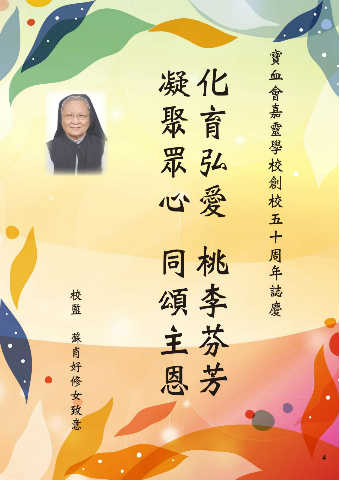凝聚眾心 化育弘愛 寶血會嘉靈學校創校五十周年誌慶 同頌主恩 桃李芬芳 校 監 蘇肖好修女致意 4