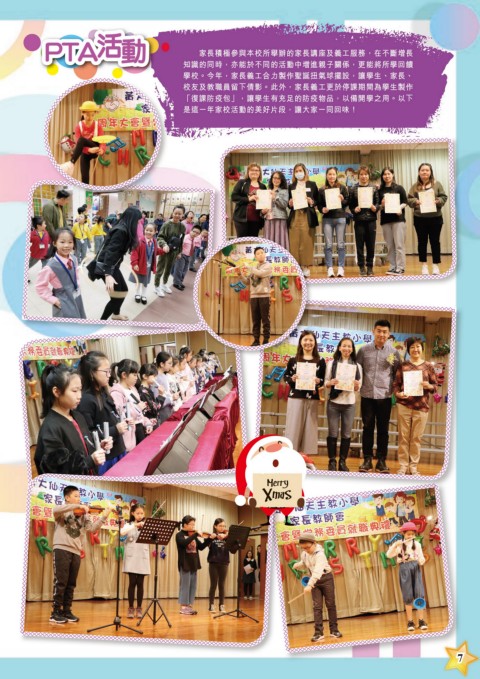 活 PTA 動動 PTA 活 家長積極參與本校所舉辦的家長講座及義工服務,在不斷增長 知識的同時,亦能於不同的活動中增進親子關係,更能將所學回饋 學校。今年,家長義工合力製作聖誕扭氣球擺設,讓學生、家長、 校友及教職員留下倩影。此外,家長義工更於停課期間為學生製作 「復課防疫包」,讓學生有充足的防疫物品,以備開學之用。以下 是這一年家校活動的美好片段,讓大家一同回味! 7 7