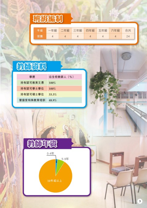 班級編制 班級編制 ϋॴ 一年級 二年級 三年級 四年級 五年級 六年級 合共 फᅰ 4 4 4 4 4 4 24 教師資料 教師資料 ኪዝ ЦΌࣧࢪɛĈ ܵϞႩ̙ԃ˖ኯ 100% ܵϞႩ̙ኪɻኪЗ 100% ܵϞႩ̙၂ɻኪЗ 33.3% ಀટաतࣿԃ 48.9% 教師年資 教師年資 0-4年 0-4年 5-9年 5-9年 10ϋא˸ɪ 3 3