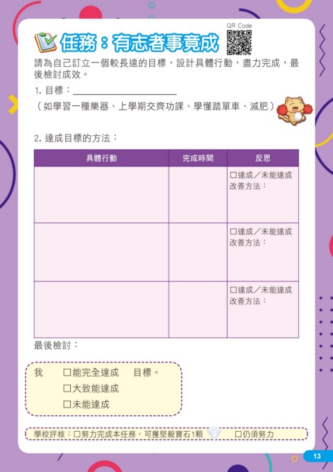 QR Code 任務:有志者事竟成 請為自己訂立一個較長遠的目標,設計具體行動,盡力完成,最 後檢討成效。 1. 目標: (如學習一種樂器、上學期交齊功課、學懂踏單車、減肥) 2. 達成目標的方法: 具體行動 完成時間 反思 □達成/未能達成 改善方法: □達成/未能達成 改善方法: □達成/未能達成 改善方法: 最後檢討: 我 □能完全達成 目標。 □ 大致能達成 □ 未能達成 學校評核:□努力完成本任務,可獲堅毅寶石1顆 □仍須努力 13